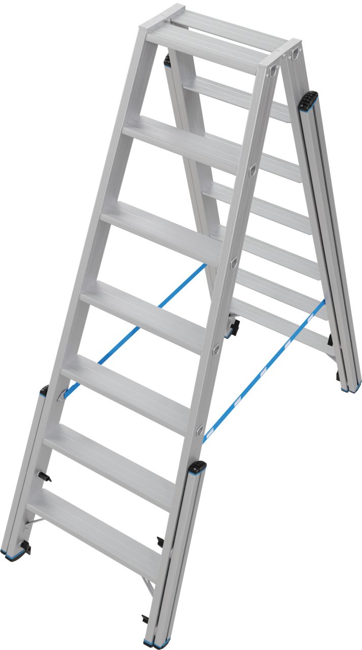 Ez a professzionális használatra kifejlesztett alumínium teleszkópos két oldalon járható létra lépcsőfunkcióval nagy stabilitást biztosít még lépcsőkön, sarkokban, emelvényeken és hasonló magasságkülönbségek esetén történő használat során is.